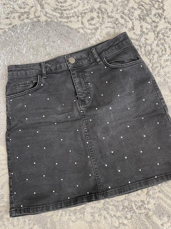 Джинсовая юбка , крой трапецией, идеальное состояние , перёд украшен стразиками, ткань тянется, пойдет на размер m и l, цвет черно-серый Замеры Поб 50 Талия 39 Длина 43