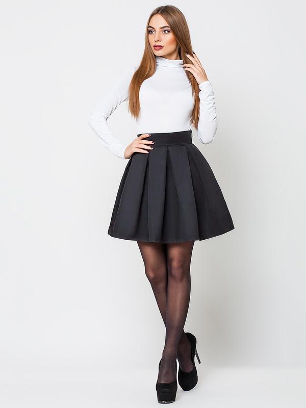 Юбка расклешенного силуэта длиной выше колена, выполнена из гладкой хлопковой ткани. Сзади предусмотрена застежка-молния.