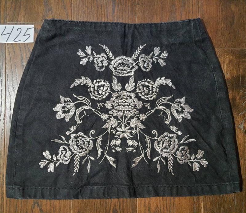 Джинсовая юбка мини с вышивкой. Застегивается на молнию. Длина 40см Полуобъем талии 36см Полуобъем бедер 47см Полуобъем по низу 51см