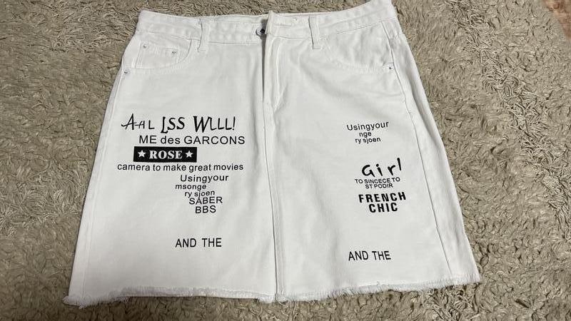 Цікава джинсова спідниця з надписами, дуже гарно дивиться, розмір м, є маленький нюанс, ззаду маленька пляма, але вона ледь помітна.