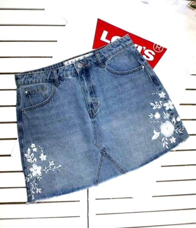 Юбка джинсовая мини ы вышивкой белый голубой Длина 44 см Талия 47 см Бедра 60 см