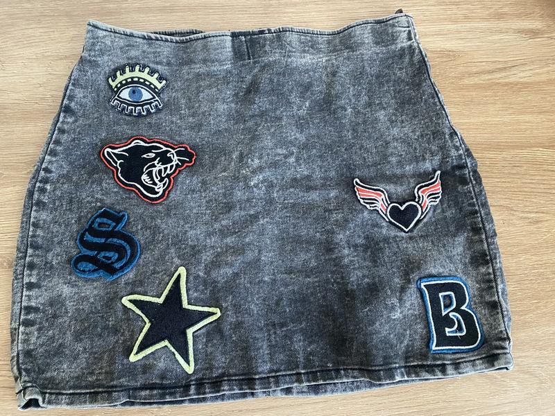 Джинсовая юбка с нашивками Длина 37 см Талия 35 ( тянется)