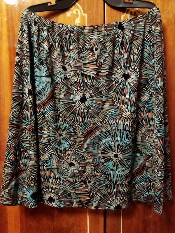 Через кнопку Купити не працюю пишіть у чаті. Півобхват талії у вільному стані 41, довжина 54. Спідниця форми трапеція, тканина добре тягнеться