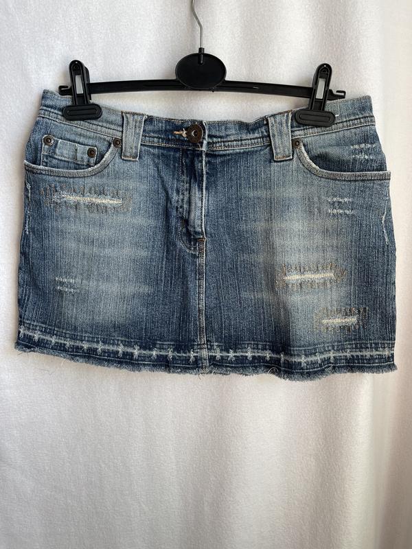 Джинсовая юбка мини, ткань слегка тянется, что позволяет посадки по фигуре. Подойдет на талию 76-78, бедра 98-50