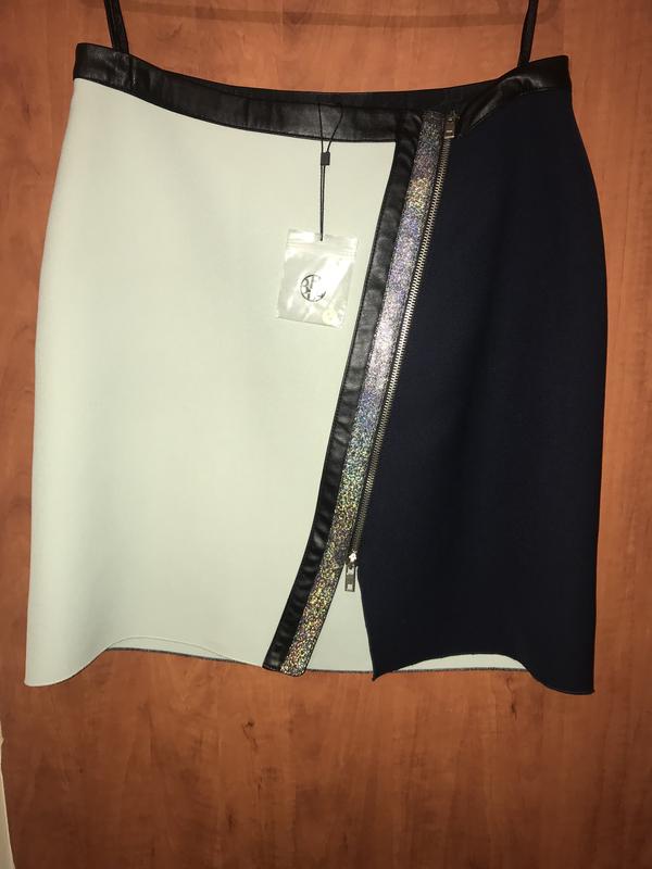 На молнии спереди. Молния полностью расстегивается до низу. Качественная плотная ткань. Пояс и лента возле молнии отделаны кажзамом. Второй кожзам возле молнии с переливающимся напыление.