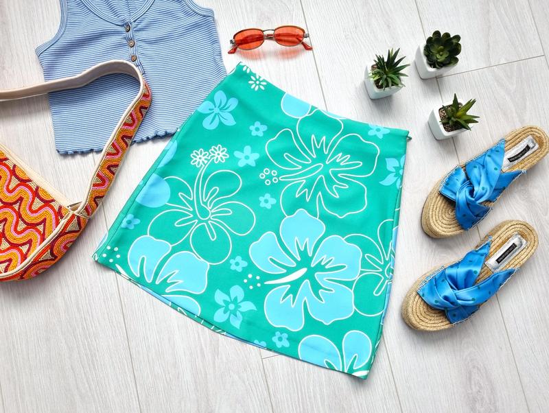 Літня міні спідниця трапеція. Посадка висока. Застібається збоку на приховану блискавку. Тканина тонка. Колір в реальності яскраво-зелений. Фото, на жаль, не передає. Заміри: напівобхват пояса - 32 см напівобхват стегон - 43 см (тягнеться до 44 см) довжина - 39 см Склад: 86% поліестер, 14% еластан
