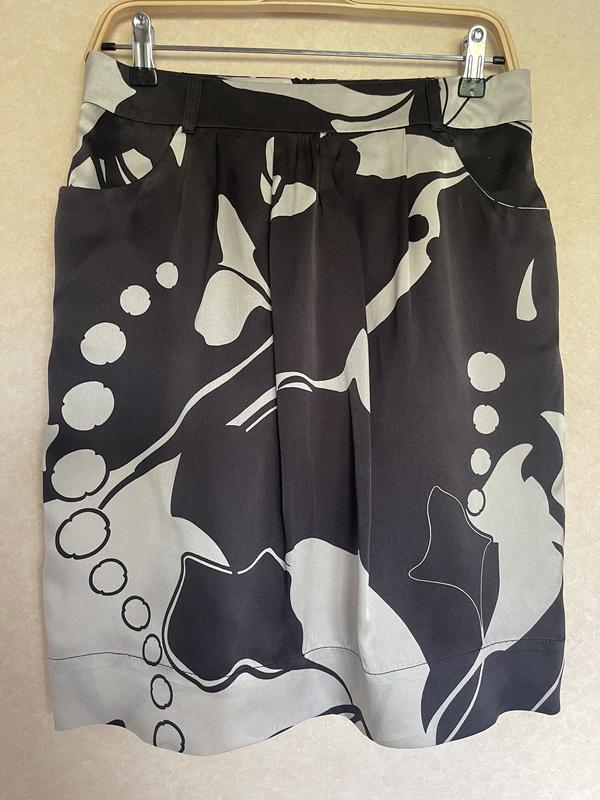 Юбочка из натурального шелка на подкладке. Интересный принт, по бокам кармашки, застежка сзади-потайная «молния». Стан идеален, без нюансов. Размер 36-38. Замеры: ПОТ-37, ПОБ-48(имеет быть свободно), длина-52