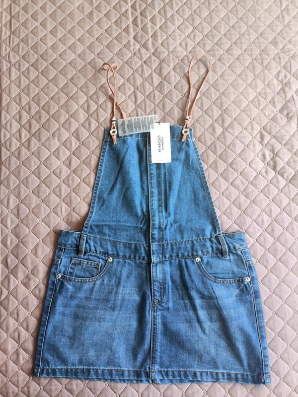 Джинсовый сарафан Mango, на кожаных брителях, состав ткани: 60% хлопок, 2% вискоза, 38% полиэстр, размер S. Замеры: длина с брителями 78 см, длина юбки 31 см, пояс 42 см. Новый