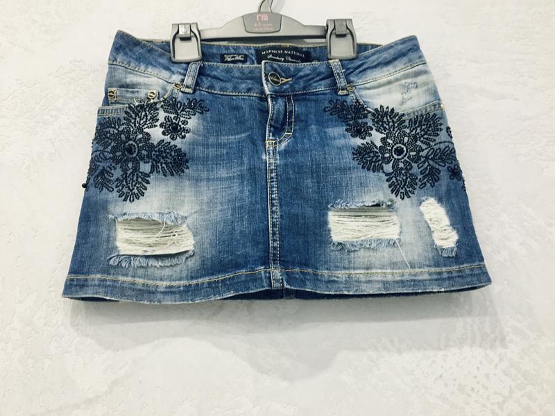Крута спідниця зі стразами та бусінами, розмір 27, тягнеться, але не сильно. Купляла комплектом до джинсової куртки
