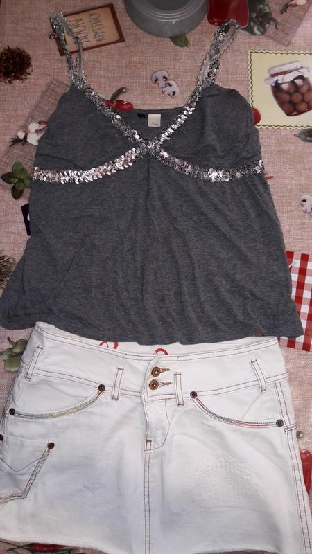 Лот біла джинсова спідниця + майка в подарунок, прикрашена паєтками, не облягає.100% котон стан якісної заміри на фото в спокійному стані.