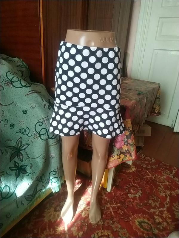 очень красивая юбка в горошек с рюшей понизу с высокой посадкой.Ткань ластиковая,хорошо тянется и держит форму.Размер хс,с. описание состояние отличное длина 42 пояс и пот 33+резинка ширина бедер 45