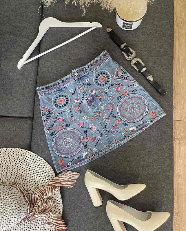 💙Крутая джинсовая юбочка с вышивкой от Denim... 100% коттон... изюминка в твоем гардеробе Denim&Co 10 р- идет на m Пояс 38 см Поб 48/ 50 см Длина 40 см