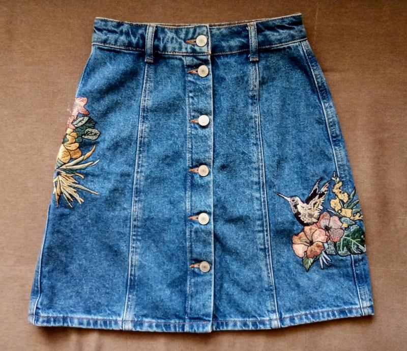 Джинсовая юбка с вышивкой фирма Denim Co, размер 34, трапеция покрой, на пуговицах. Состояние новой. Замеры: пояс 32см, длина 45см. В бедрах 44см, в низу ширина 50см.