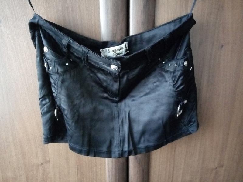 Чорна, атласна спідниця з металевими закльопками.