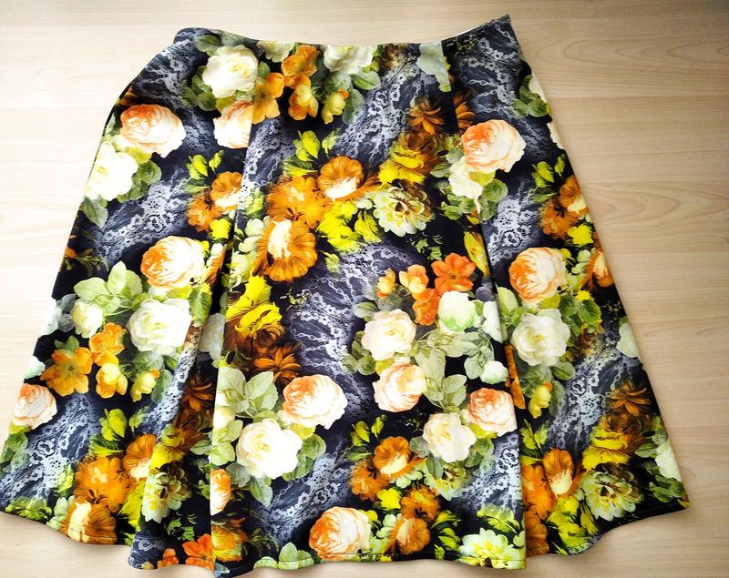 трикотажная юбочка с двумя встречными складками спереди насыщенный цветочный принт талия на резинке, сбоку молния, длина 52 см талия 70-80 см
