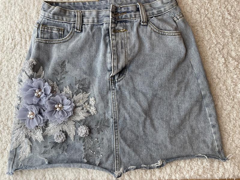 Джинсовая юбочка с цветочной отделкой.Все замеры указаны на фото,так как перешивавшая, бо размер был забольшой.Стан-идеальный, одевала 3-4 раза.Без дефектов,цветы приклеены качественно, отпадают.Шарный, присахарный джинс.