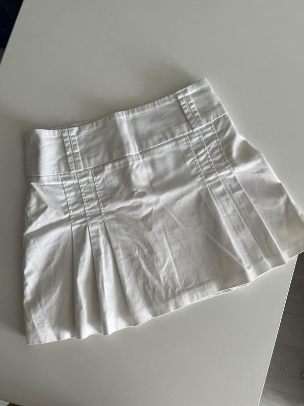 Трендовая юбка мини белого цвета. Сзади на молнии, есть лямки под ремень. Подойдет под кроссовки и каблуки. Материал плотный, не светит. Размер S-M (ориентируйтесь на замеры модели). Одет на параметры 89-62-90, рост 174