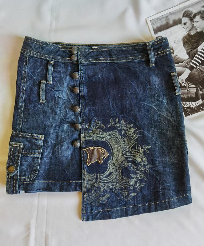 Джинсова спідниця в стильному незвичайному дизайні. Темний денім, в комплект іде довгий пояс, який перехрещується (як на фото), можна носити й без. Спідниця нова, але без бірки. По боках кишені, функціональні, гудзики теж функціональні. Склад: 98% котон, 2% еластан. По бірці розмір US W27, що відповідає обхвату талії 70-72 см; обхвату стегон 94-96 см. 44 наш розмір, 38 європейський, S-M. Заміри по виробу: в талії 40 см, середина 47 см, висота 46,5 см.