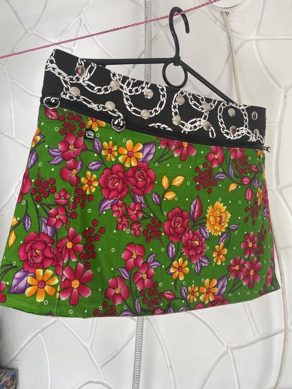 Мультиразмерная уникальная юбка-трансформер от амстердамского бренда Zand. Два варианта носки: низ можно носить разными сторонами наружу. Длина мини (беля 35см). Подходит на размеры от С до ХХЛ за счет кнопок на которые застегивается на поясе. Также присутствуют карабинчики к которым можно прицепить небольшую сумочку или чехол с наушниками. Состояние без роптания. Очень необычная вещь, для тех, кто любит выделяться. На последнем фото цены на такие юбки заграном.