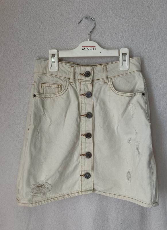 Рвана джинсова спідниця, стильно виглядає. Застібка на ґудзики. Наявний маленький, ледве помітний дефект — плямка спереду. Довжина: 41 см