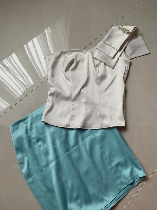 Топ в молочном цвете на одно плеча с отделкой, длина 50см юбка 46см длина Тканина атлас стрейч