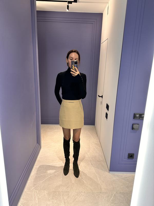 Короткая юбка из фактурной тканы, декоративным элементом - цепочка. Для хорошей посадки выполнены вытачки. Размер 34 Длина изделия 39 см Объем талии 70 см Обсяг стегон 90 см Ширина по низу виробу 90 см
