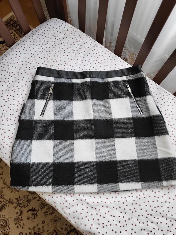 Теплая юбка в клетку мини от бренда F&F. Стан очень хорош, на подкладе, застегивается сбоку на замок, имеет два кармана на замки. Пояс из эко кожи. Без нюансов. Заміри на фото. Размер XL.