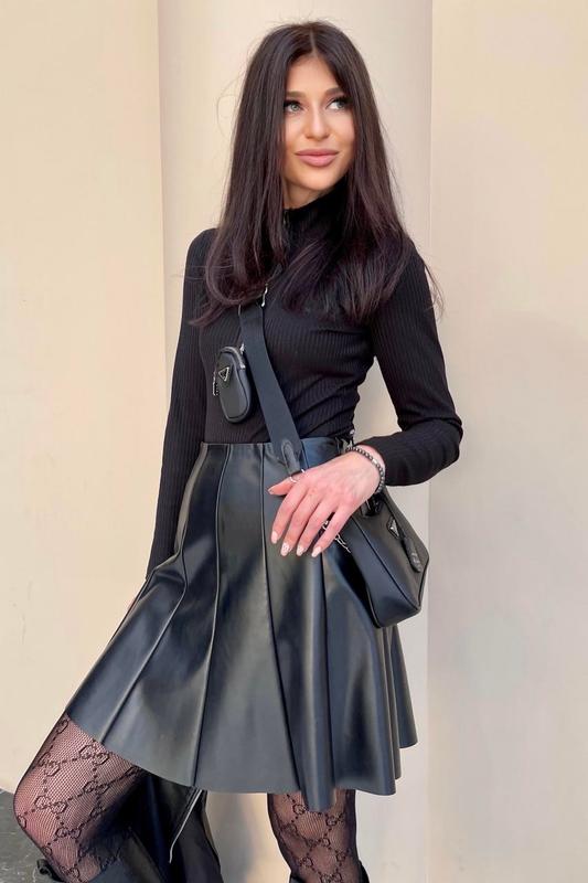 Юбка Дейни Тканина: еко-шкіра на флісі Состав: 94% полиэстер, 6% другие волокна, Цвет черный Размер: S, M, L, XL Параметры модели на фото: Зріст: 170 см, ОГ: 86 см, ОТ: 64 см, ОС: 93 см. На фото представлена модель размер S (42/44). Фактические замеры по изделию: Объем талии: S-64; M-68; L-72; XL-76; Объем бёдер: S-94; M-98; L-102; XL-106; Длина изделия по боку: S-45; M-45,5; L-46; XL-46,5;