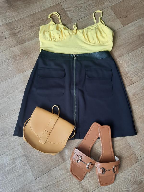 Стан нової, без дефектів. Має спереду два кармани та застібку, а також на талії шкіряну вставку. Довжина-46 ПОТ-41 ПОБ-54 Ширина низу-60