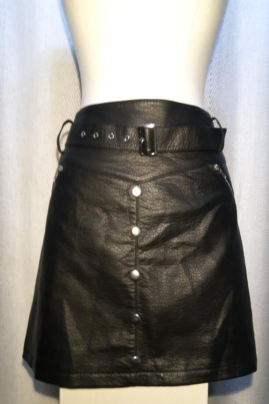 Жіноча брендова спідниця шкіряна еко-шкіра з поясом, ньюанс з підкладкою, виміри: напівобхват пояса 58-59 см, стегон 67 см, низу 70 см, Довжина 46 см, ззаду два розрізи по 7,5 см Не тягнеться ньюанс на останньому фото