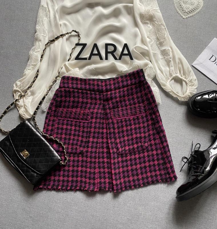 Мини юбка zara, цвет фуксии, фиолетовый, чёрный, в клетку, твидовая, трапеция, с карманами