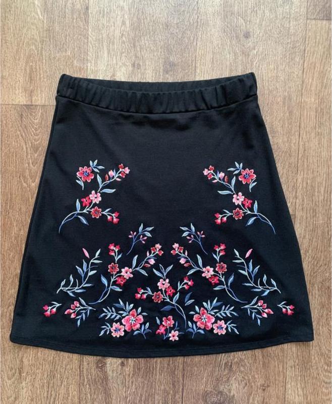 Юбка с вышивкой размер М, длина 51 см, полуобхват талии по резинке в спокойном состоянии 35 см, тянется до 51 см, полуобхват бедер 52 см, 68% вискоза, 27% полиэстер, 5% эластан