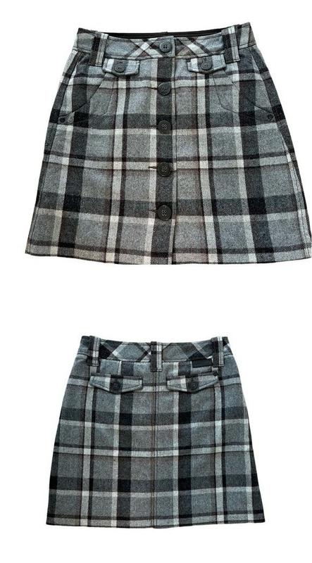 Серая мини-юбка в клетку Esprit с пуговицами спереди и боковыми карманами с отделкой; задние карманы с застежкой на пуговицы; шлейки; на подкладке повсюду. Внешний материал шерсть. Замеры: длина 45см, обхват талии 80см, обхват бедер 100см
