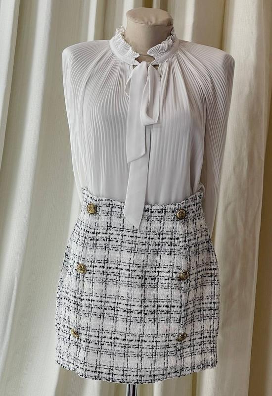 Юбка мини из белого букле с вкраплениями черного SHEIN🛍️❤️ Размер - UK 10/ EUR 38/ USA 6/ M / 44-46. Состав : 50% хлопок, 50% полиэстер. Производитель Китай. Юбка облегающего кроя, мини. Спереди украшена металлическими пуговицами, есть боковая молния. Без подкладки. Дополнительные замеры: полная длина 40 см, полуобхват пояса 38 см (полный обхват 76 см), полуобхват бедер 50 см (полный обхват 100 см).