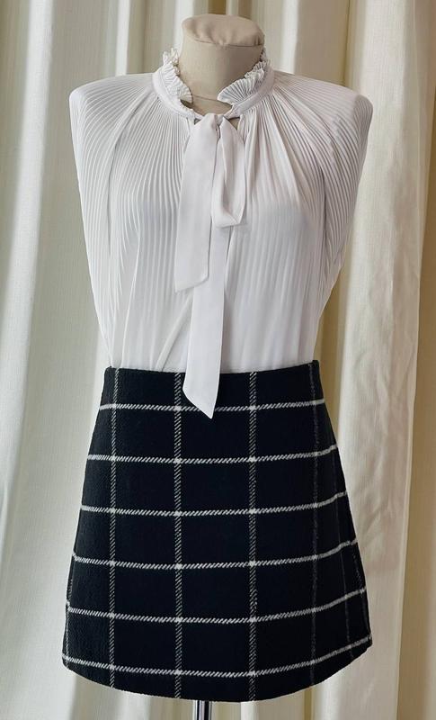 Юбка черная в крупную белую клетку GEORGE🛍️❤️ Размер - UK 8-10/ EUR 36-38/ S-M / 44-46. Состав: 94% полиэстер, 3% вискоза, 3% нейлон. Подкладка : 100% полиэстер. Производитель Вьетнам. Юбка короткая из теплого материала на подкладке. Сзади металлическая молния. Дополнительные замеры: полная длина 40 см, полу охват талии 37 см (полный охват 74 см), полуобхват бедер 50 см (полный обхват 100 см - замер по подкладке).