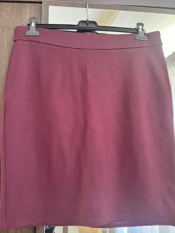 Юбка трикотажная, бордового цвета. Длина 54, ПОТ 43, ПОБ 50.