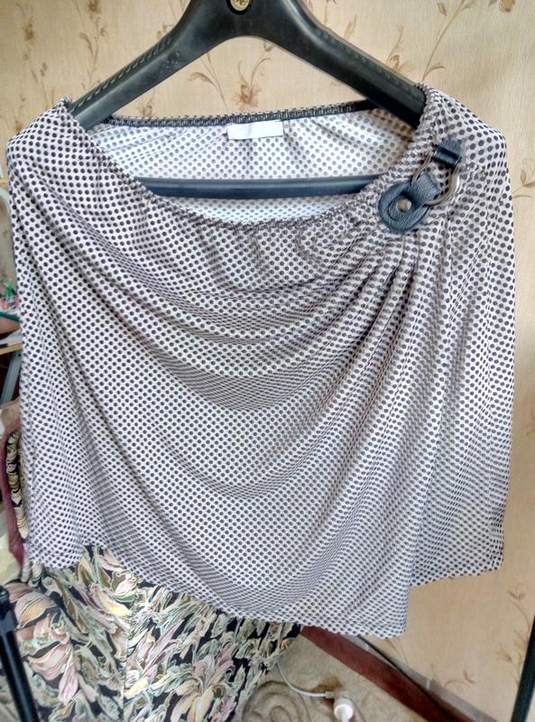 Предлагаю трикотажную юбочку, интересного пошива, как бы на запах с красивой декоративной пряжкой. Пояс на тоненькой резиночке, можно носить на бедрах, кому как удобно.Цвет очень спокойный: на фоне кофе с молоком небольшой горох. Она станет любимой в Вашем гардеробе. Бирка срезана.