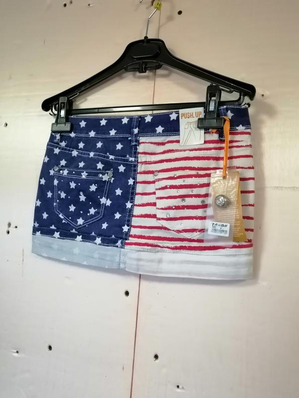 джинсовая юбка мини, украшена стразами, пуговица с камнями, есть дополнительная запасная пуговица, Принт американский флаг со звездами, юбка абсолютно новая со всеми фабрическими бирками, но требуется стирка, размер на бирке указан S, состав 98% Катон 2% эластан, полуобхват талии 34 см тянется на 40 см, полуобхват бедер 41 см тянется на 47 см, длина юбки 27 см Допускаю погрешность измерениях плюс-минус 1 см