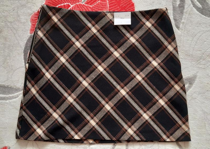 386 Весеннее-осенняя короткая юбка. Нова. Без поясу ( на бедрах). По бокам две молнии ( одна, декоративная). Без подкладки. Размер 12/14. Полуобхват в поясе 46 см, бедра 57 см, ширина по низу 64 см, длина 47 см.