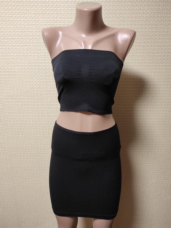 Набір топ та спідниця з стрейчевої тканини, гарно тягнеться. Топ: ширина 28 см, довжина 20 см. Спідниця: довжина 40 см, ширина 35 см.