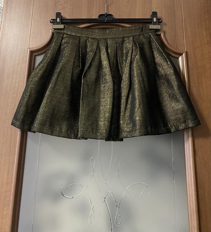 Юбка в идеальном состоянии. Цвет золотистый. Склад тканини на фото. Со стороны потайная застежка. С внутренней стороны пояса есть с одной стороны резинка, для уменьшения объема в талии. Длина 39 см ПО в поясе сверху 37,5 см. Возвращение нет. Доставка за счет покупателя