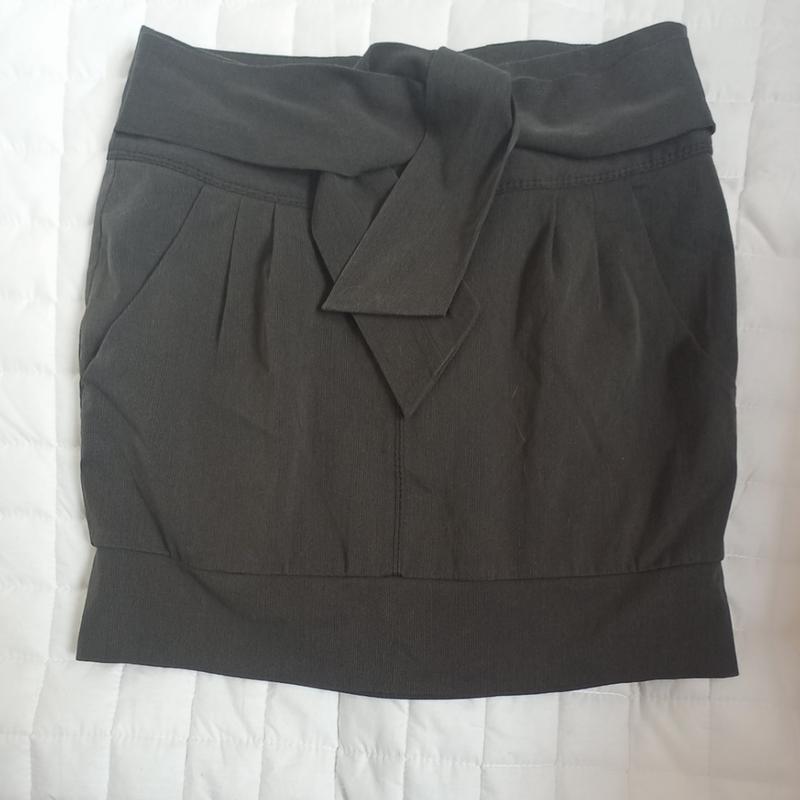 юбка мини темно серого цвета с черной подкладкой. спереди два врезных кармана и 4 шт.защипа на поясе.обманная ширинка.с боков пришита пояс лента для завязки с любой стоны в бант.сзади тонкая змейка .ткань немного тянится..состава ткани не увидел.ткань мягкая приятная на прикосновение.в очень мелкую светлее ткани полосочку точечную...размер-40. замеры;36- талия + лента завязка*40- длина*43- низ.юбка с виду прямая.