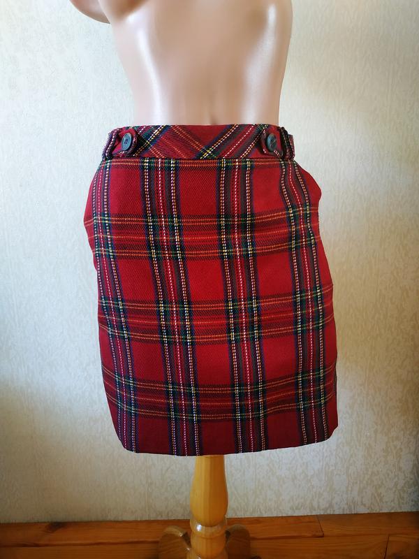Яскрава міні-спідниця у клітинку, основний колір - червоно-бордовий. Довжина 46 см, Пот 37 см, Поб 51 см, низ 55 см