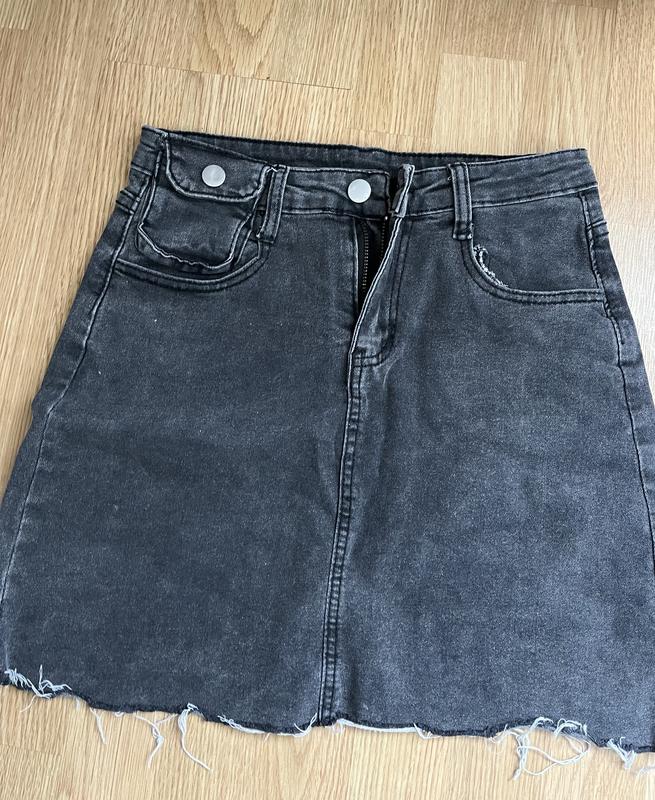 Юбка темно серого цвета, с необработанным краем, материал джинс. Размер хс-с, на худи, невысокую девочку. Состояние новой, потому что одевала несколько раз