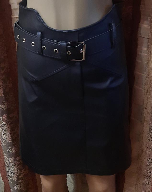 Юбка из экокожи прямого силуэта с поясом. Застежка на молнию.