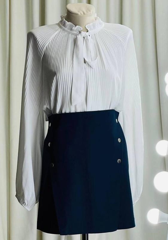 Спідниця темно-синього кольору з декоративними відстрочками переду та кнопкам ZARA BASIC🛍❤️🔥 Размер - UK 12/ EUR 40/ MEX 30/ USA 8/ M-L/ 46-48 Склад: 49% поліестер, 47% котон, 4% еластан. Підкладка: 100% поліестер. Виробництво Туреччина. Спідниця завдовжки до колін зі щільного й еластичного матеріалу. Середньої ширини пояс із блискавкою ззаду. Перед із косими прострочені швами, по лінії стегон на них по 3 кнопки. Дві врізні кишені ( декоративні) ззаду. Тканина добре тягнеться. Додаткові виміри: повна довжина 44 см (з них висота пояса 5 см), напівобхват талії 40 см (повна обхват 80 см), напівобхват стегон 50 см (повна обхват 100 см), напівобхват низу спідниці 56 см (повна обхват 112 см, довжина змійки пояса 16 см.