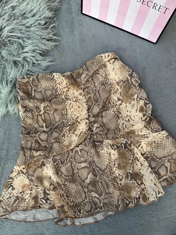 ❗ УВАГА❗️ ▪️Перш ніж робити замовлення звʼяжіться з продавцем для уточнення наявності, замірів, нюансів. Оскільки ПРИМІРКИ, ОБМІНУ ТА ПОВЕРНЕННЯ НЕМАЄ. ▪️ ДІЄ ТІЛЬКИ 100% ОПЛАТА. ▪️ ПРИ ОФОРМЛЕННІ ЧЕРЕЗ КНОПКУ "КУПИТИ" діє передплата 200 грн на замовлення від 2000 грн НОВОЮ ПОШТОЮ. ▪️ Післяплата НЕ ДІЄ на спідню білизну, купальники,одяг для дому/сну та косметику/догляд. Трендова спідничка в зміїний принт с зборочками на попі для ефекту пуш апа та оборками внизу. Легка, але одночасно сексі Стан нової, сток магазин. По талії - 35 см По бедрам - 40 см тягнеться до 45 см Довжина 45 см