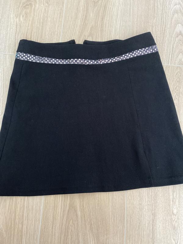 Классическая мини юбка черного цвета с блестками, со стороны небольшой разрез. Состояние очень хорошее.