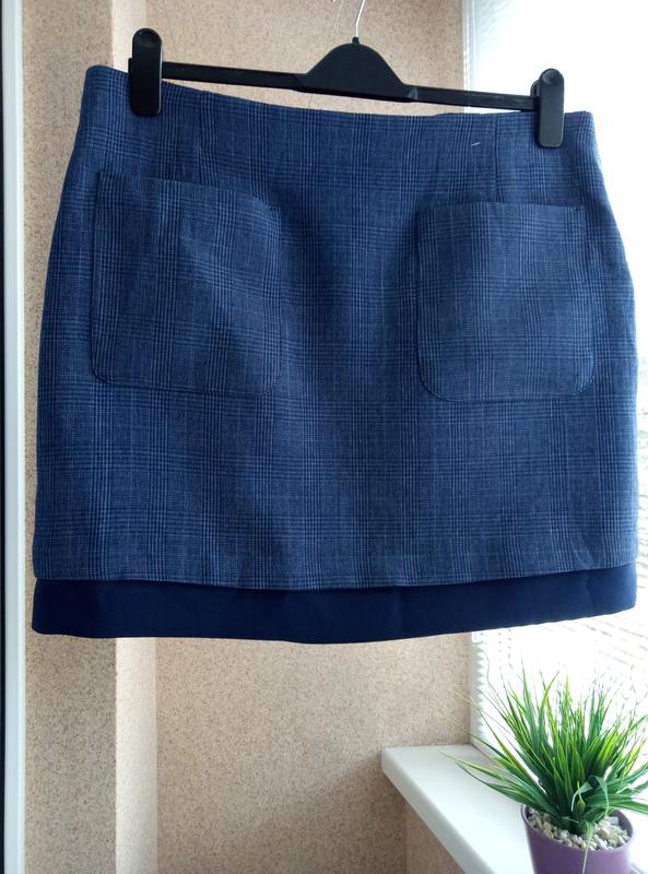 Юбка мини с накладными карманами в непринужденную клетку синего цвета. Без подкладки. Состояние новой вещи, без бирки. Полуобхват талии - 48см, Полуобхват бедер - 58см, Полуобхват по низу - 59см, Длина юбки - 47см.