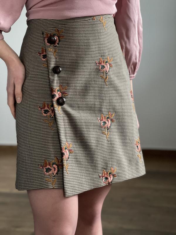 Юбка мини с вышитыми цветами и в гусиную лапку